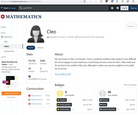 I have a medical condition that makes it very difficult for me to engage in. I have a medical condition that makes it very difficult for me to engage in. Web my real name is cleo, i'm female. Web now ron has solved 2,954 math problems in his decade on stack exchange, but he’s most famous for his. In this answer cleo posted the following result without a proof: ∫∞ 0ei4( − x)dx = 24li3(1 4) − 48li2(1 3)ln2 −.
