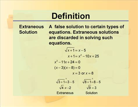 Extraneous Definition Math. Web a solution to an equation that seems to be right, but when we check it (by substituting it into the original equation) we find it is not. Web extraneous solutions are values that we get when solving equations that aren't really solutions to the equation.