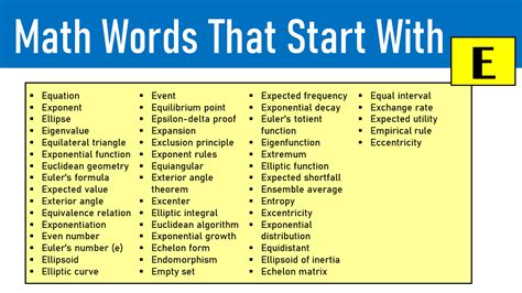 Math Words That Start With E. Web math glossary terms beginning with e. Find definitions of all math terms with letter e, explained with informational pictures and.