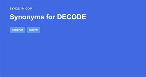 Another Word For Decode. Decipher, decrypt, break, crack, translate, solve, render, unscramble; Browse related words to learn.