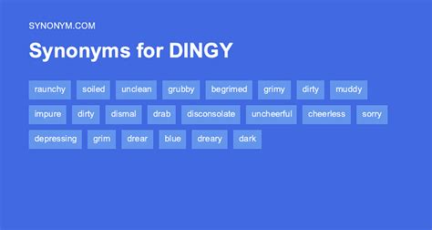 Another Word For Dingy. Filthy, dusty, stained, blackened, muddy, dirty, black, grimy; Web find 2,793 synonyms for dingy and other similar words that you can use instead based on 11 separate contexts from our thesaurus.