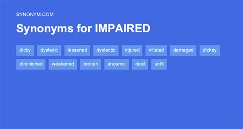 Another Word For Impairing. Web find 1,763 synonyms for impairing and other similar words that you can use instead based on 14 separate contexts from our thesaurus. Damaging, injuring, marring, compromising, crippling, weakening, hurting, harming;