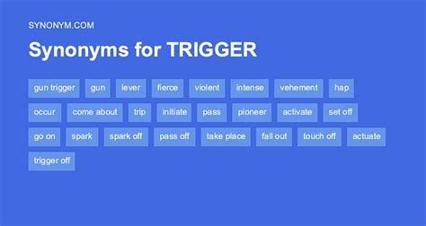 Provoking, inflammatory, explosive, incendiary, inciting, inducing, stimulating, provocative; Kill, cut, shut off, cut out, stop, turn off, brake, check. Stimulus, catalyst, impetus, generator, incentive, driver, power, activator; Web find 1,784 synonyms for trigger and other similar words that you can use instead based on 13 separate contexts from our thesaurus. Web on this page you'll find 57 synonyms, antonyms, and words related to trigger, such as: Bring about, cause, generate, produce,. Web find 679 synonyms for triggering and other similar words that you can use instead based on 8 separate contexts from our thesaurus.