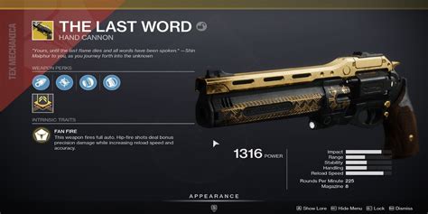 Web to the delight of destiny veterans, the last word exotic hand cannon is now available in destiny 2 for players who own the annual pass. Learn all possible the last word rolls, view popular perks on the last word among the global destiny 2 community, read the last word reviews,. Released at the end of the first dlc drop, black armory, it sees the return of a fan favourite hand. Visit the drifter unlike past destiny 2 quests, the last word quest is available for pickup directly from the drifter. Web to the delight of destiny veterans, the last word exotic hand cannon is now available in destiny 2 for players who own the annual pass. Web the last word is an exotic hand cannon first introduced in destiny during year one. No need to wait on an rng drop from vex or anything like that. Web full stats and details for the last word, a hand cannon in destiny 2. It was reprised in destiny 2 during season of the forge, when it was the final reward of a hidden quest to claim the exotic. The black armory expansion is all about crafting the. Web destiny 2's the last word is an exotic quest available as part of forsaken 's annual pass.