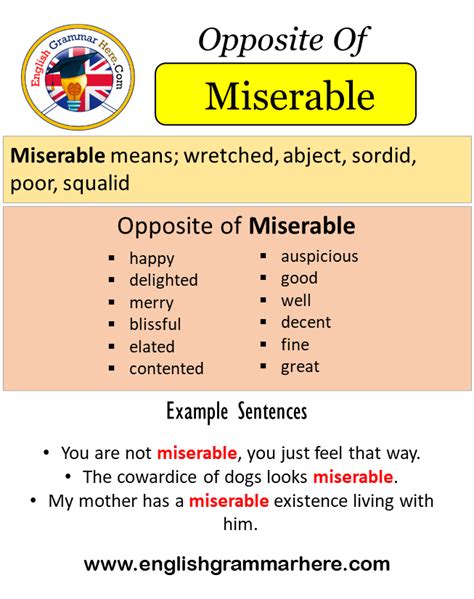 Miserable Opposite Word. August, beneficent, commanding, dignified, exalted, glorious, grand, great, helpful, lofty, mighty, noble, sublime,. Antonyms for miserable (opposite of miserable).