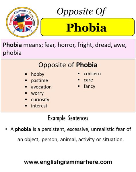 Phobia Opposite Word. Opposite of a psychological, irrational or obsessive fear of (something) bent. Web find 31 different ways to say phobia, along with antonyms, related words, and example sentences at thesaurus.com.