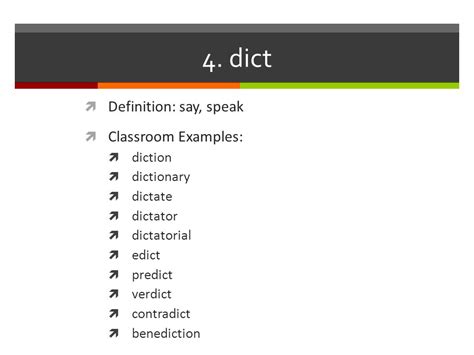 Root Word Of Dict. The latin root word dict and its variant dic both mean ‘say.’. Web it is the hypothetical source of/evidence for its existence is provided by: