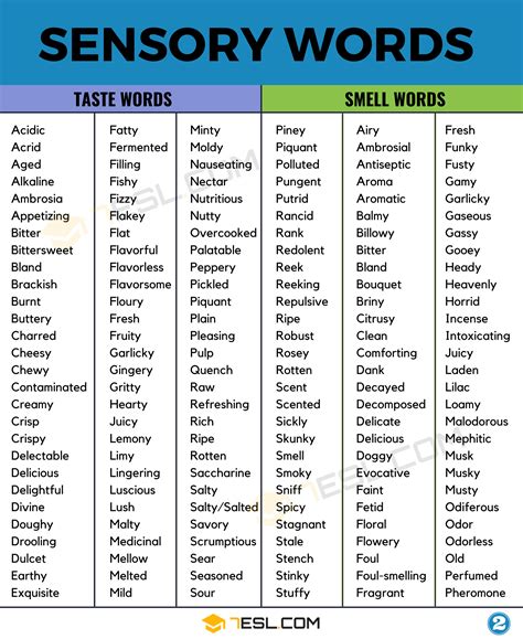 Sensory Word Examples. One option is to create an anchor chart and to write down examples as you read. They can be used in any aspect of your manuscript, including dialogue, setting descriptions, and action.