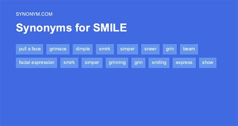 Smile Another Word. Web synonyms and antonyms of smile in english smile noun these are words and phrases related to smile. Grin, laugh, beam, sneer, smirk, simper, snicker, snigger;