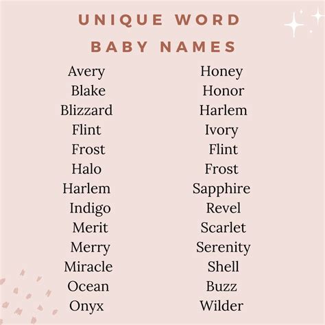 Adagio — to perform in slow tempo (adverb) 4. None of the names chosen has ever been given to. Unique names are more appealing than ever, with over a quarter of babies now receiving rare names below the us top 1000. Web a selection of our favorites is below, sorted into ten popular categories, or you can view the full shiny new list of unique word names for babies here. Absquatulate — to leave somewhere abruptly (verb) 3. Web 300 wonderful word names from dictionary, for boys & girls getting pregnant how to get pregnant symptoms infertility pregnancy pregnancy week by week food second pregnancy safety. Alfresco — taking place or. Adagio — to perform in slow tempo (adverb) 4. Abomasum — the fourth stomach of a ruminant, such as a cow or sheep (noun) 2. Web word names — basically, words used as names — are a growing class as parents rush to find truly unique baby names for their children.