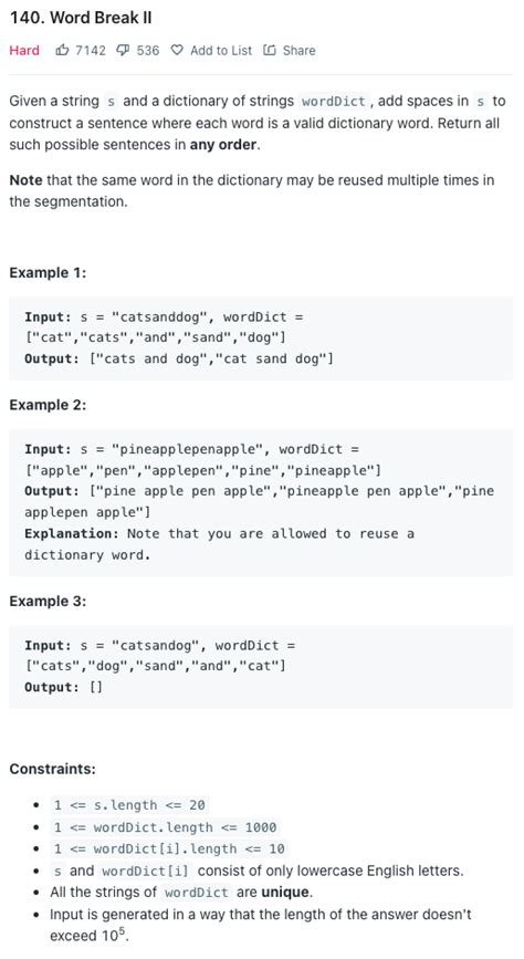 It is a very important interview problem on string. There are multiple techniques to solve this using dynamic programming as. This is the best place to expand your knowledge and get prepared for your next. Return all such possible sentences in any order. Note that the same word in the dictionary. Web this video explains the word break 2 problem from leetcode #140.